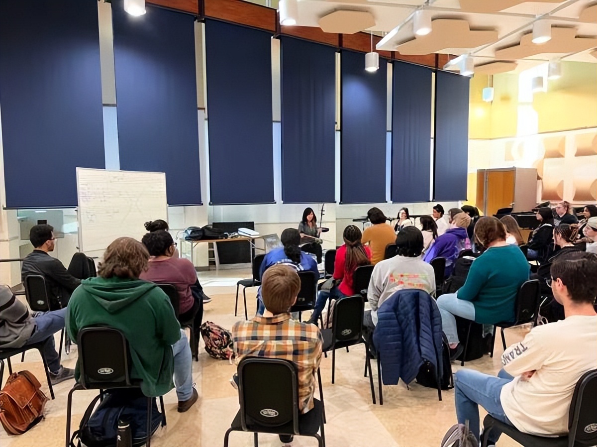图为陈洁冰在美国大学为学生带去二胡体验课。(受访者供图)