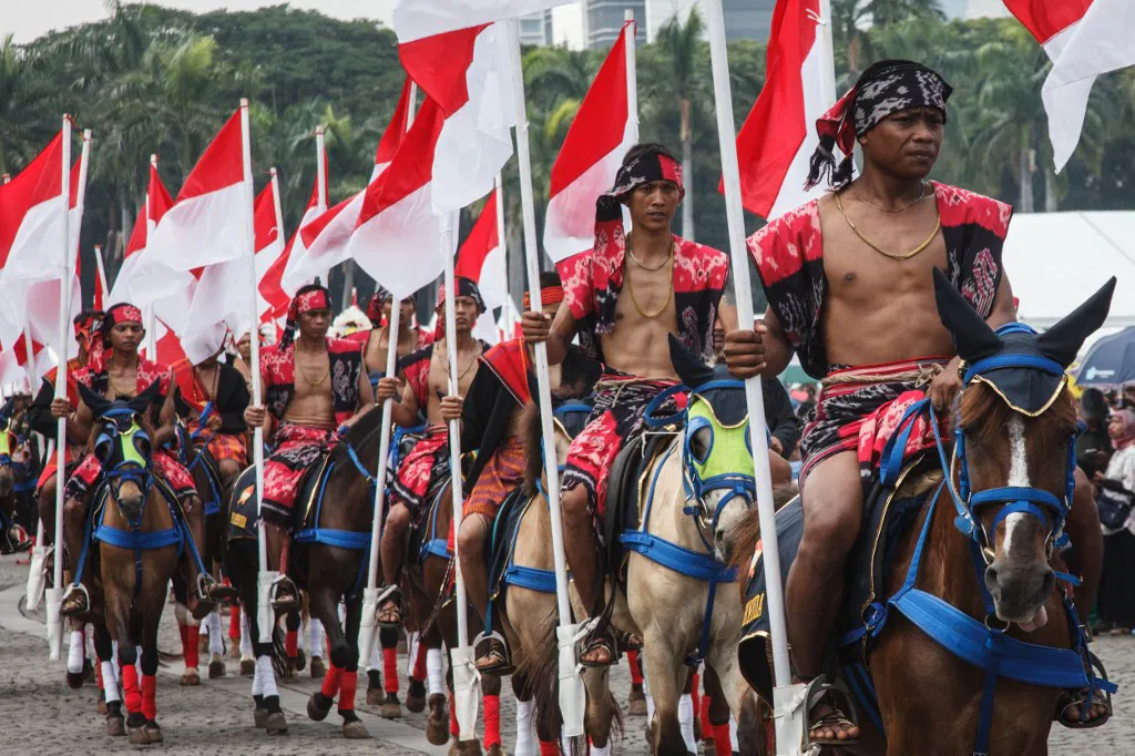 印尼国家武装部队预备役部队(Komcad)成员手拿印尼国旗、骑在马背上列队行进。(图自法新社)