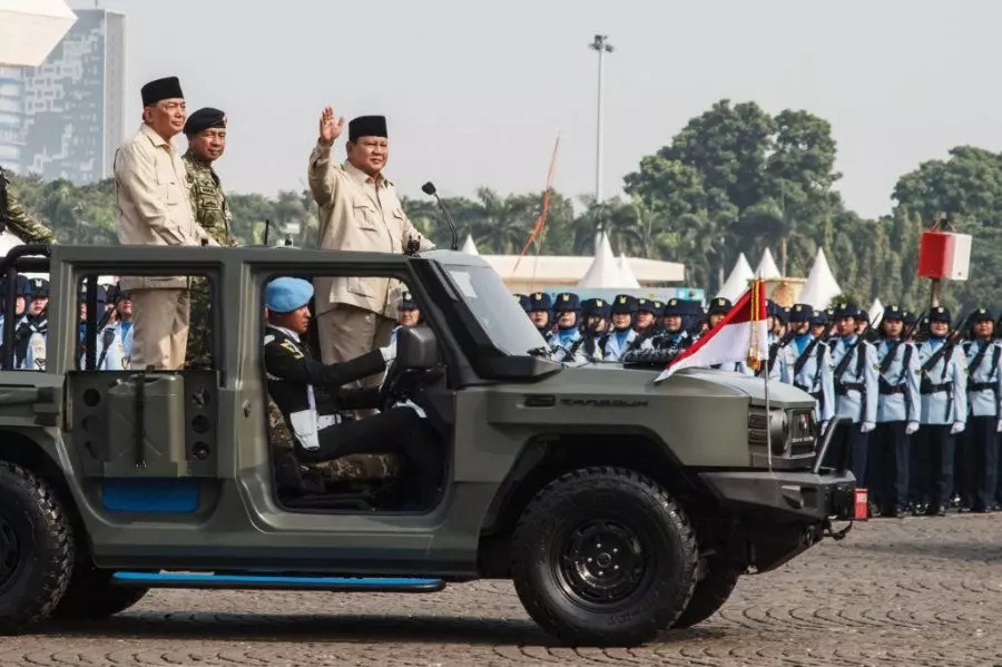 普拉博沃总统(右)和国防部长沙弗里.沙姆苏丁(左)在检阅军队。(图自法新社)