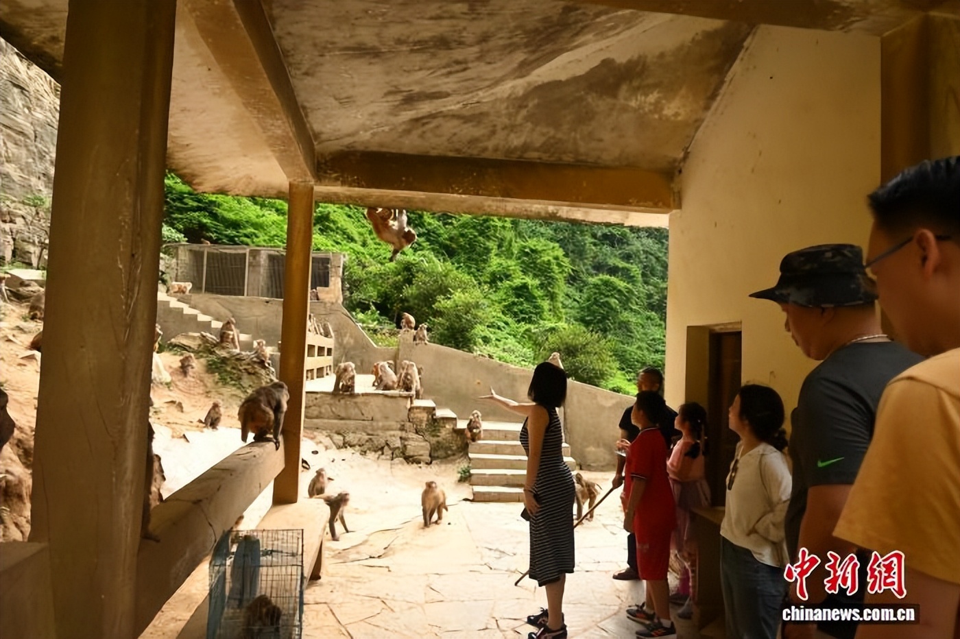 9月10日,新加坡游客游览重庆渝北统景温泉,与景区内的猴群互动。张旭 摄
