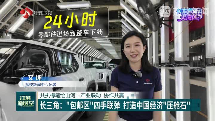 荔枝新聞中心記者文坤說:「這輛新能源汽車從零部件進場到整車下線,僅用了24小時:昨天上午,上海研發中心的工程師敲定了自動駕駛系統參數;中午,江蘇常州的動力電池、蘇州的車載顯示屏就運到廠區;下午,浙江寧波的電機、安徽合肥的底盤部件陸續進場;今天一早,所有零部件在無錫的總裝線匯合,現在它已經可以駛下生產線,準備交付客戶了。這樣的效率,不是偶然。長三角早已形成『研發+製造+配套』的全鏈條汽車產業生態,可以說在半徑四小時車程的『包郵區』內,從硬件到軟件,從設計到製造,新能源汽車所需的零部件全部都能配齊。」