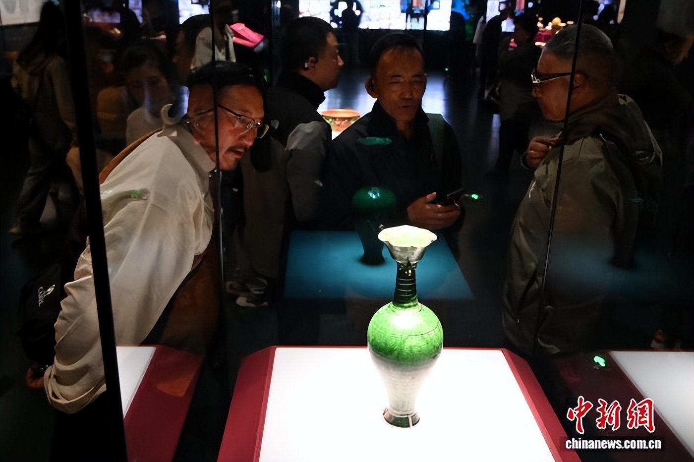 藏胞在内蒙古博物院参观辽代“绿釉刻牡丹纹凤首花口瓶”。 中新网记者 刘文华 摄