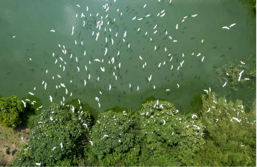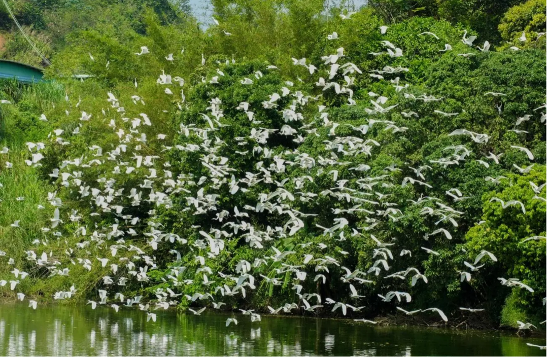 Hampir seribu burung bangau melayang dengan anggun ke ladang-ladang di Komite Desa Luobang, Kecamatan Jiancheng, Kabupaten Yunnan, Provinsi Guangdong. Burung bangau merupakan spesies yang dilindungi secara nasional dengan status Kelas II. Dikenal sebagai “burung indikator untuk pemantauan kualitas udara dan air,” burung ini membutuhkan kondisi lingkungan yang sangat ketat untuk bertahan hidup. Tarian anggun mereka di antara sawah dan tepi sungai, di mana bulu putih murni mereka kontras indah dengan air zamrud dan bukit-bukit hijau, menggambarkan pemandangan ekologi yang harmonis dan hidup.