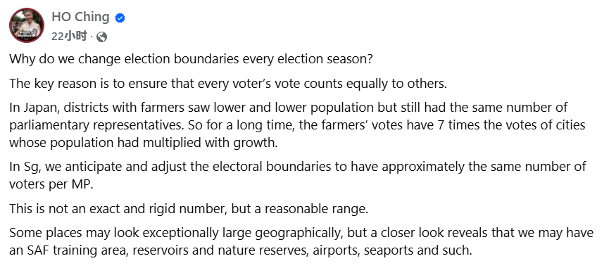 李显龙夫人何晶近日在社交媒体上谈及新加坡选区划分的原则。她指出,核心目的是为了确保“每位选民的选票价值大致相等”。她解释道,新加坡会通过调整electoral boundaries,使每个国会议员所代表的选民数量保持在大约2万至3万人之间,以此实现票值公平。