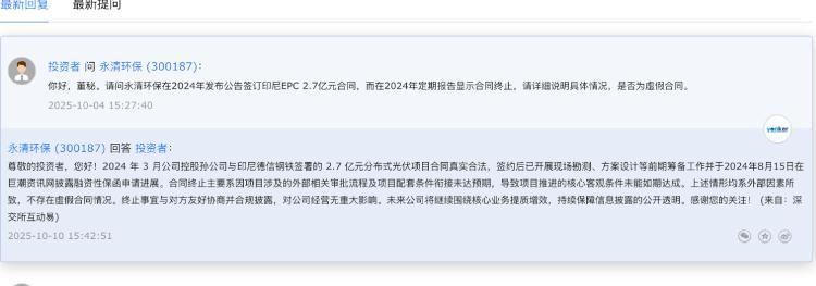尽管永清环保在互动易平台回应称合同“真实合法”,终止源于“外部审批流程及项目配套条件衔接未达预期”,但这一回应仍难以完全消除市场的疑虑。