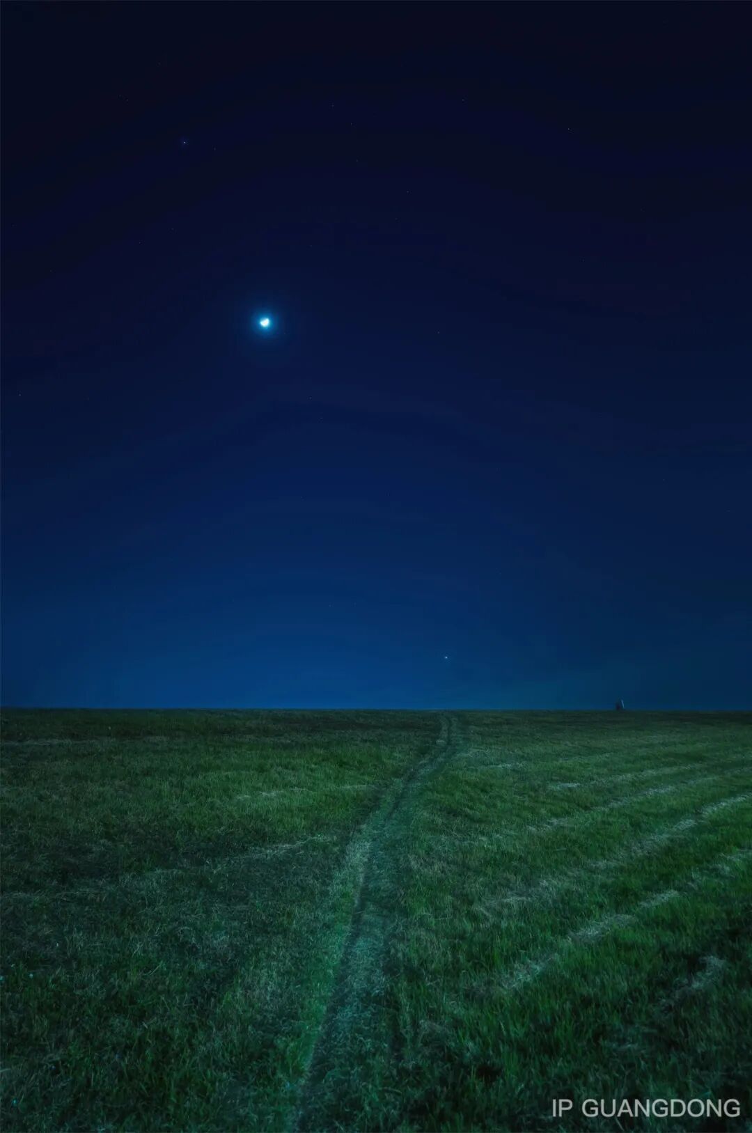 在北江大堤上,明月悬挂于天幕,洒下淡淡清辉;不远处,金星如璀璨钻石般闪耀,与月亮遥遥相伴,构成“金星伴月”的独特天象。
