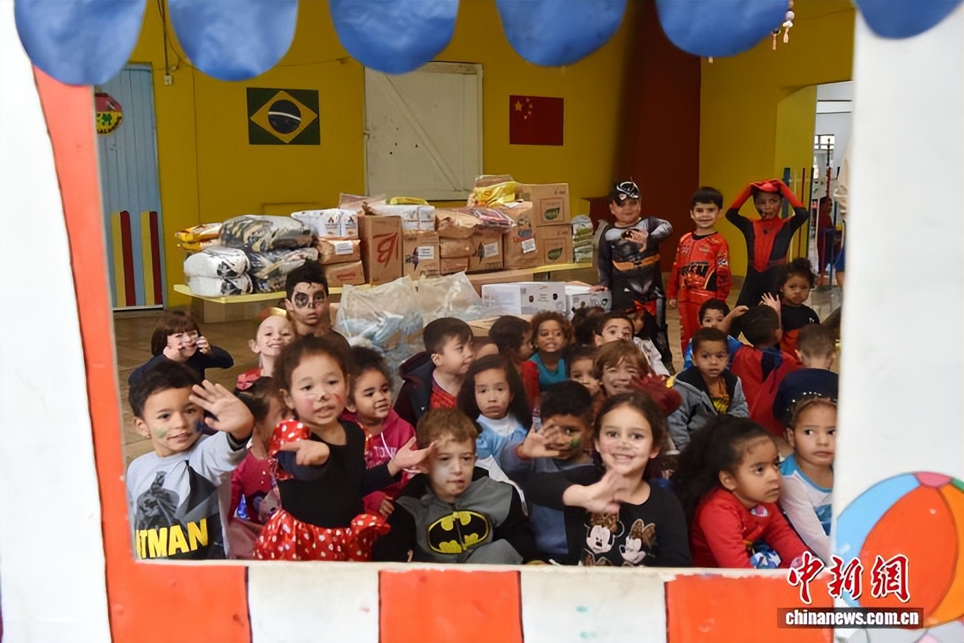 巴西圣保罗圣安德烈市“山谷之光”福利幼儿园的孩子们在华社捐赠的爱心物资前游戏。记者林春茵摄。