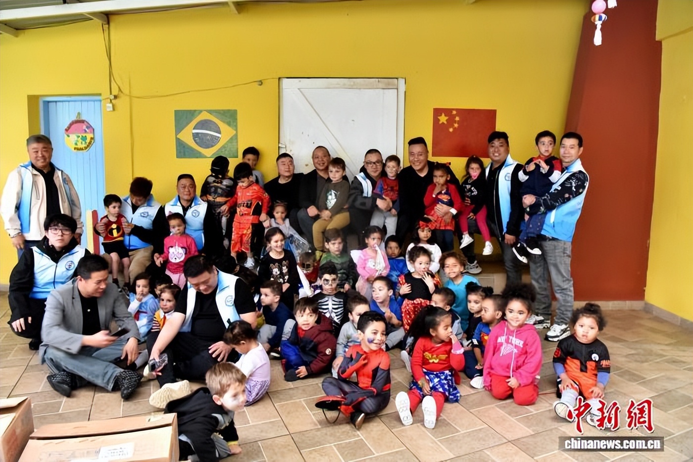 多家圣保罗华社联袂捐助巴西福利幼儿园,侨领代表与幼儿们游戏合影。记者林春茵摄。