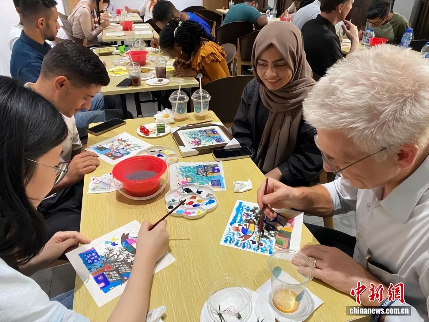 在金山农民画体验环节,来自印度尼西亚的留学生ADDALEIA JAEDDEN CYREESE仔细观察了老师的示范作品后,蘸取橙色颜料,轻轻在画纸上晕染出树上的柿子,又用深棕色颜料勾勒出枝干纹路。