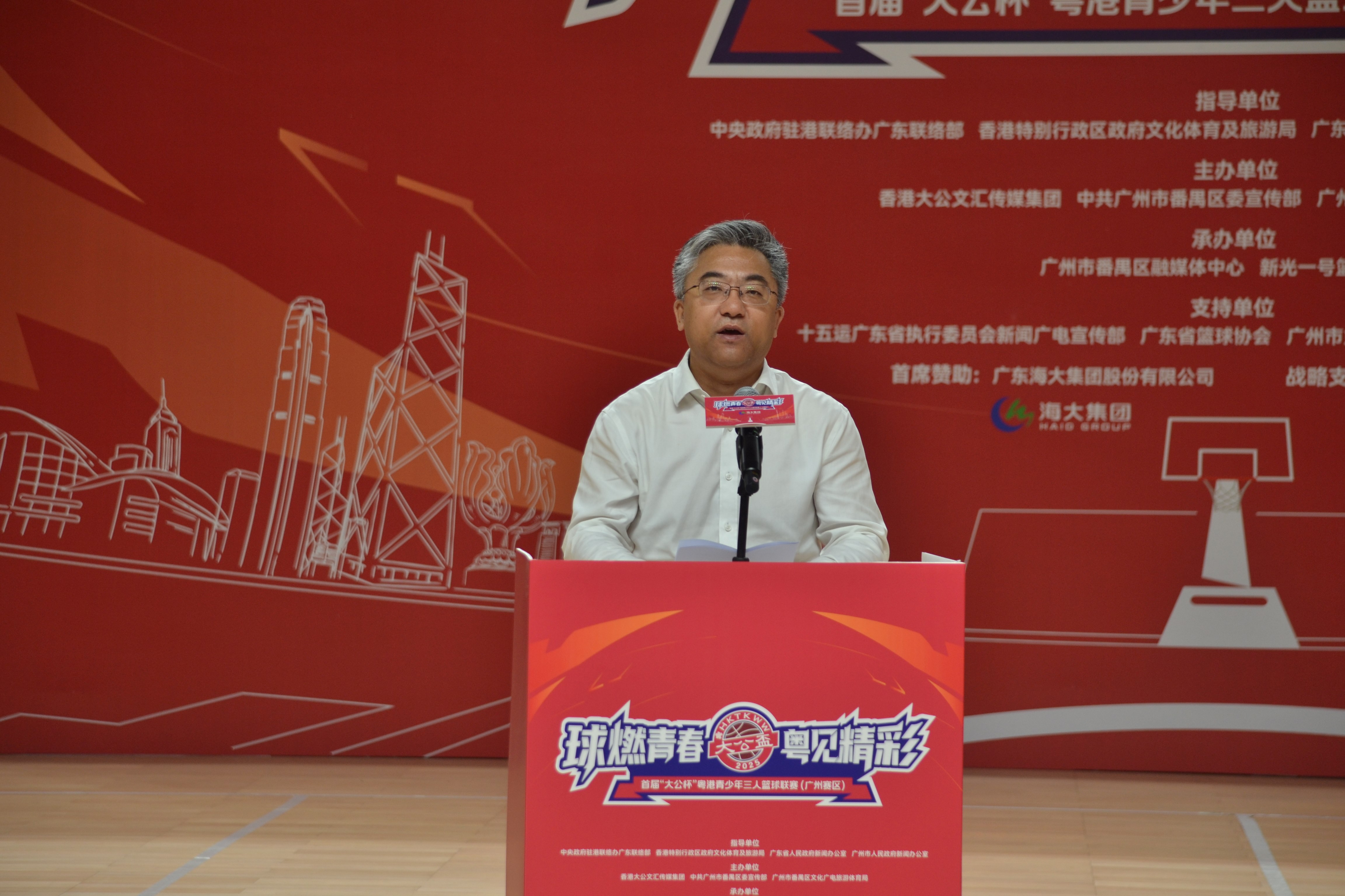 香港大公文匯傳媒集團副董事長、總經理鄭勇男在致辭中表示,「大公盃」是香港最具影響力的校園籃球賽事,今年首次拓展設立廣東賽區,正是對粵港深度融合大勢的積極順應。他特別提到,賽事期間同步開展的「國際青年體驗官廣東行」活動,將組織兩地青少年一同走訪廣東多地,實地感受灣區發展新貌,讓體育交流與文化體驗實現深度融合,期待這一活動能成為粵港協作交流、深入融合的生動縮影。