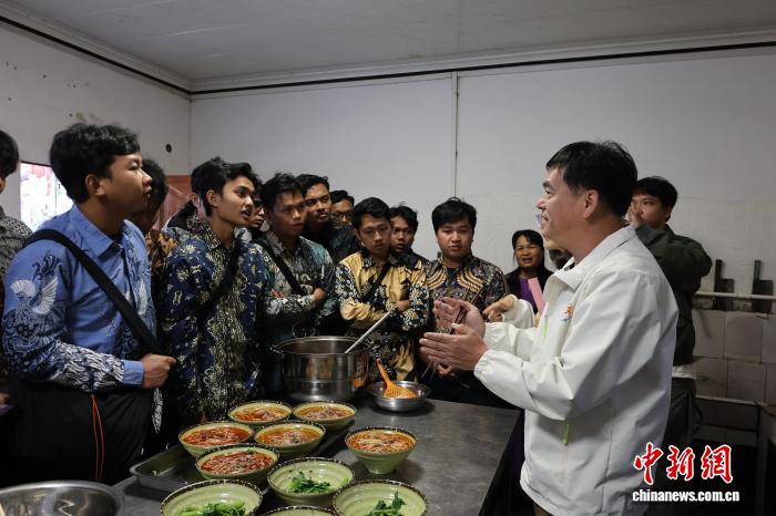 图为柳州螺蛳粉制作技艺非遗代表性传承人陈伟(右)给印尼留学生介绍柳州螺蛳粉做法。林馨 摄