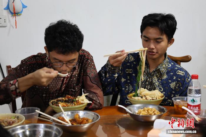 图为印尼留学生品尝柳州螺蛳粉。林馨 摄
