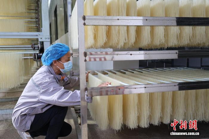 10月22日,来自柳州职业技术大学的29名印度尼西亚留学生,走进广西柳州市螺蛳粉原材料产业基地。在柳城县社冲乡,印尼留学生们跟随柳州螺蛳粉制作技艺非遗代表性传承人一同了解米粉制作工艺、参观柳州螺蛳粉配料木耳生产基地、品尝地道的柳州螺蛳粉,以此感受柳州螺蛳粉文化魅力。图为工人检查米粉。林馨 摄