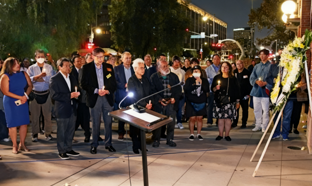 洛杉矶讯 10 月 24 日晚,洛杉矶华美博物馆举行“华埠大屠杀”154 周年VV纪念活动,以花圈敬献、烛光游行、颂钵祈福等仪式,追悼 1871 年 10 月 24 日在洛杉矶华埠种族暴力事件中遇难的 18 名华裔受害者。洛杉矶市长巴斯(Karen Bass)、联邦众议员赵美心(Judy Chu)、加州众议员方树强(Phil Ting)等政要,以及社区领袖、学者、艺术家等约 150 人现场参与,共同呼吁铭记历史、反对仇恨。