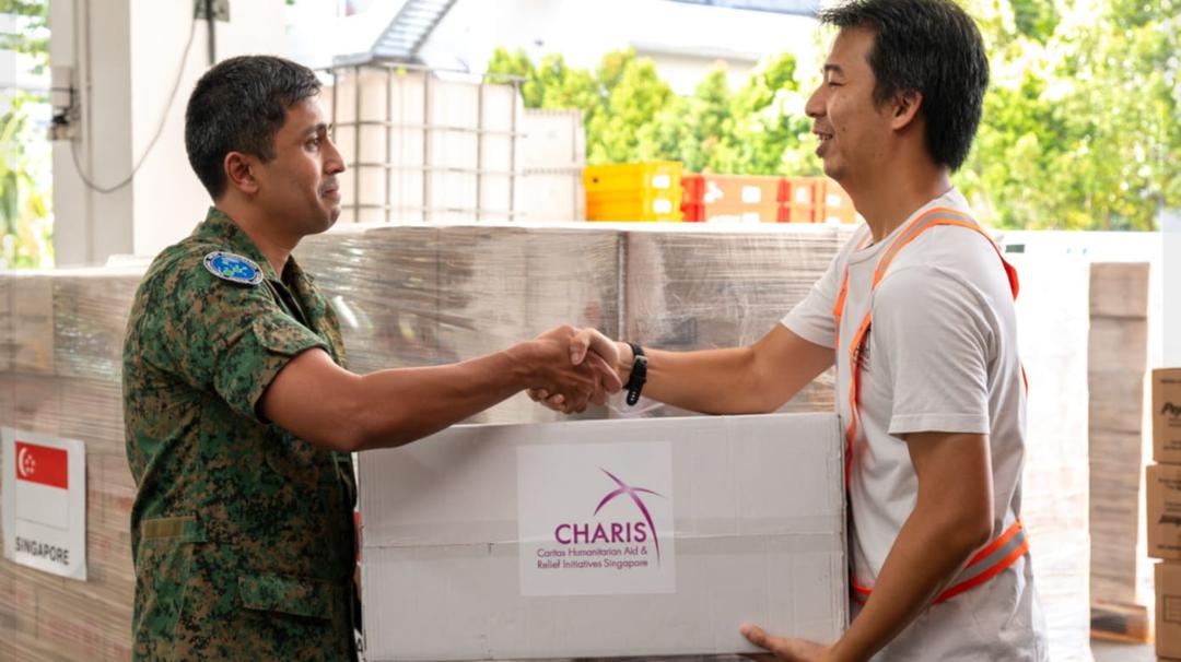 武装部队和非政府组织明爱人道援助与救济(Caritas Humanitarian Aid and Relief)共捐赠超过五吨救援物资,并将通过商业空运运往越南,这些援助物资包括保暖毯和卫生用品包。
