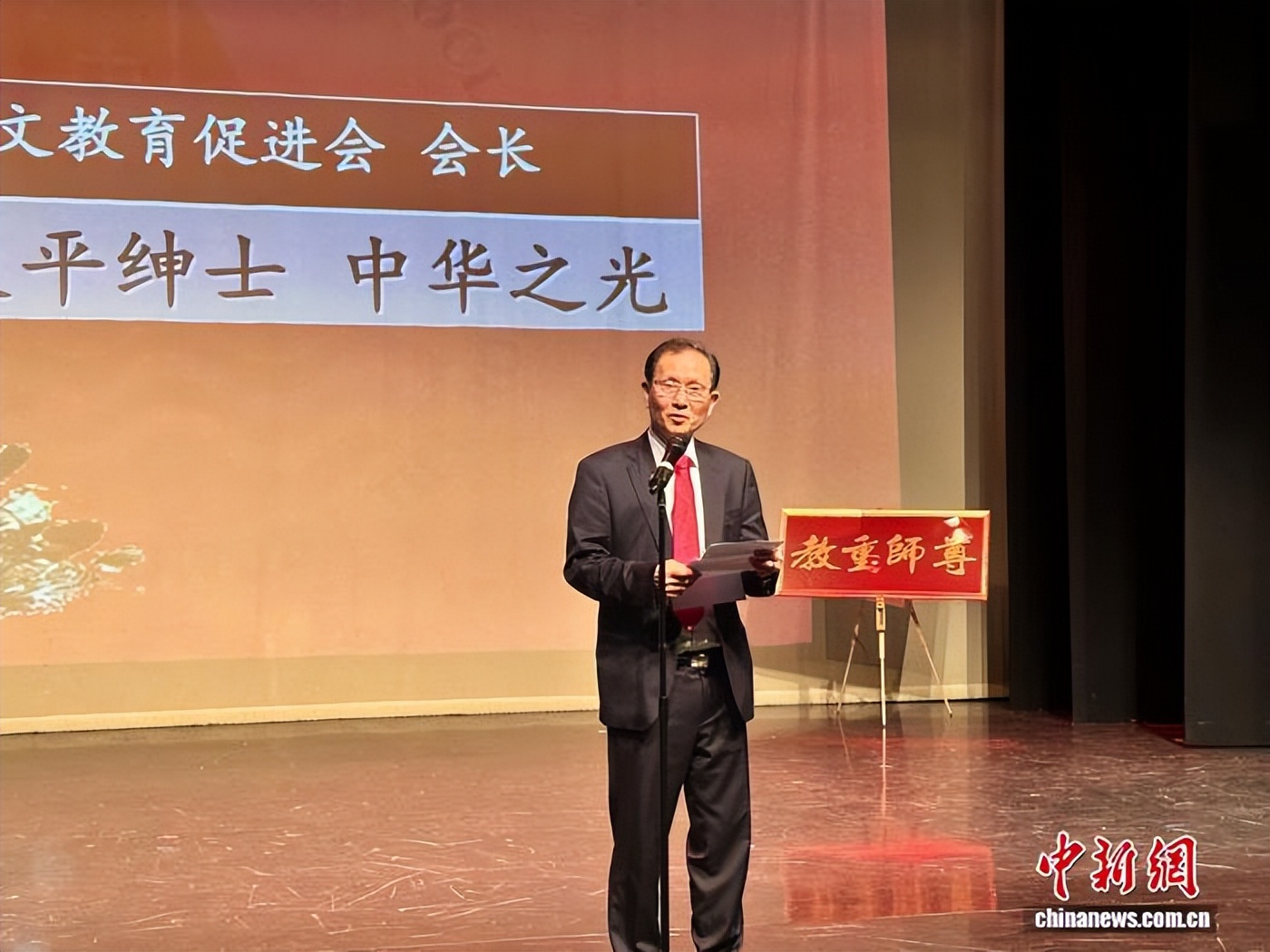 在表彰环节,经各校推荐评选,94位敬业奉献的教师获”优秀华文教师”称号。当获奖教师身披红绶带登台时,颁奖嘉宾站立其侧,以行动诠释对教育工作者的敬意。