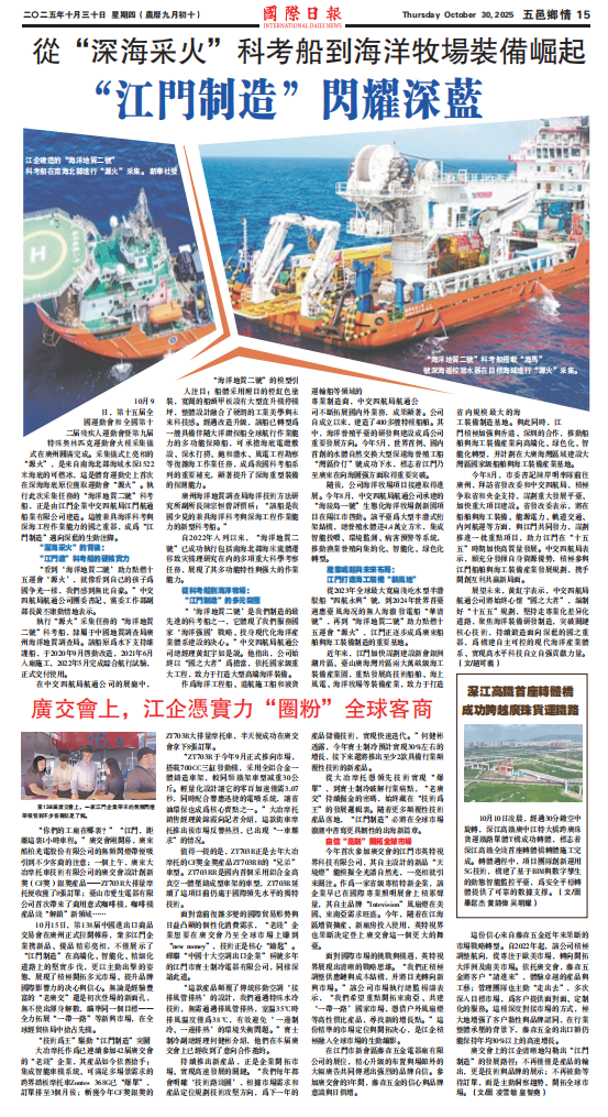 10月9日,第十五届全国运动会和全国第十二届残疾人运动会暨第九届特殊奥林匹克运动会火种采集仪式在广州圆满完成。采集仪式上亮相的“源火”,是来自南海北部海域水深1522米海底的可燃冰,这是体育运动史上首次在深海海底原位获取运动会“源火”。执行此次采集任务的“海洋地质二号”科考船,正是由江门企业中交四航局江门航通船业有限公司建造。这艘兼具海洋科考与深海工程作业能力的国之重器,成为“江门制造”迈向深蓝的生动注脚。