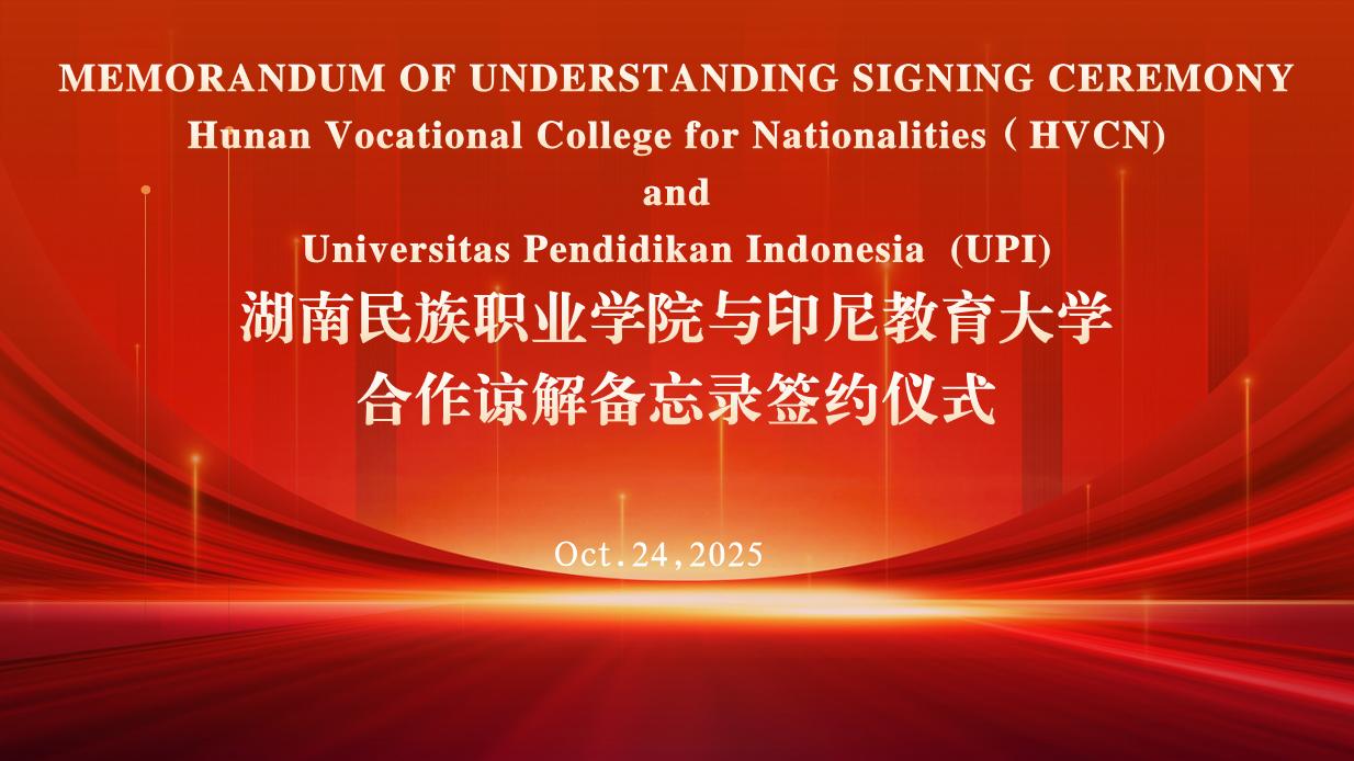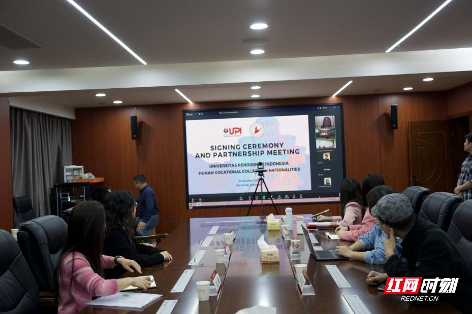 红网时刻新闻日岳阳讯(通讯员 刘珊)10月24日下午,在中国与印度尼西亚建交75周年的重要历史背景下,湖南民族职业学院与印尼教育大学举行线上合作谅解备忘录签约仪式,以云端为桥,共同开启两校教育交流与合作的新篇章。学校副校长邹欣欣、国际交流学院院长周玲、创意设计学院院长柴彬彬及相关负责人共同出席。