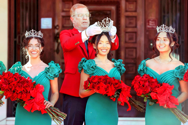 国际日报洛杉矶讯 10月28日,帕沙迪纳玫瑰宫(Tournament House)门廊前掌声雷动,亚凯迪亚高中华裔学生郭睿恬(Serena Guo)在加冕典礼上正式当选第107届玫瑰皇后。2026 年玫瑰花车大游行协会主席马克・利文斯(Mark Leavens)亲手为其戴上饰有600多颗养殖珍珠与6克拉钻石的御木本(Mikimoto)皇冠。