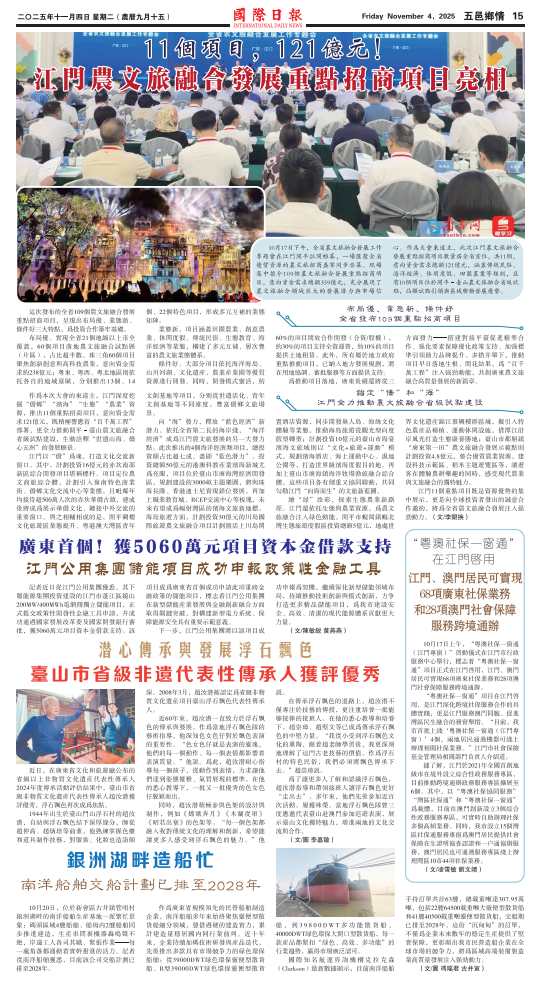江门11个重点项目既是资源优势的集中展示,更是向全球投资者发出的诚意合作邀约,将为全省农文旅融合发展注入强劲动力。(文/李银换)