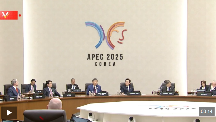 当地时间11月1日上午,国家主席习近平在韩国庆州出席亚太经合组织第三十二次领导人非正式会议第二阶段会议,并发表题为《共同开创可持续的美好明天》的重要讲话。