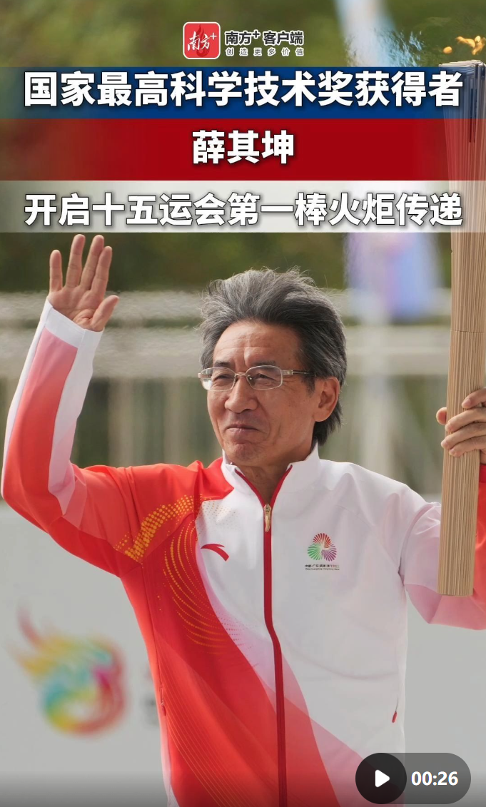11月2日上午,第十五届全国运动会火炬传递启动仪式在深圳举行。9点25分,南方科技大学校长、中国科学院院士、国家最高科学技术奖获得者、国际著名实验物理学家薛其坤手持第一棒火炬出发。
