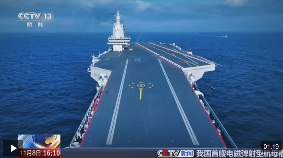 11月5日,我国第一艘电磁弹射型航空母舰福建舰在海南三亚某军港入列。8日下午,海军新闻发言人冷国伟就福建舰部署地点、舰载机配备和中国海军航母发展计划等问题,接受记者书面采访。