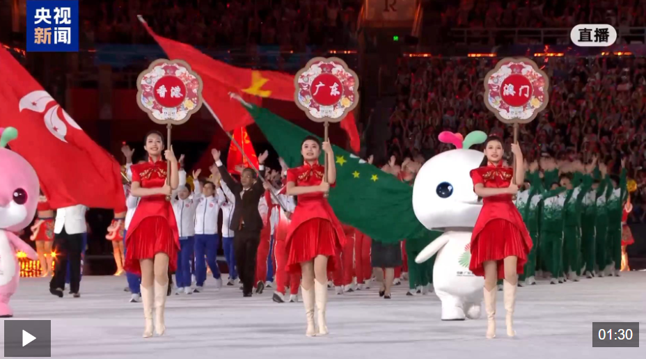 首次粤港澳三地运动员联合入场,体现三地体育健儿携手弘扬中华体育精神,共铸时代荣光。