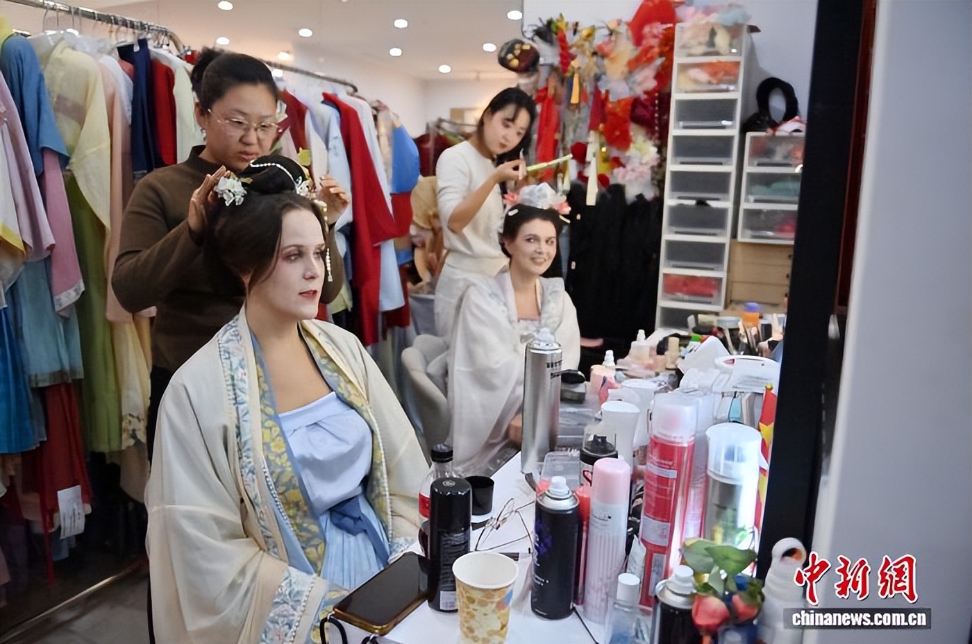 11月9日,在吉林长春的一家汉服体验馆,德国友人在进行汉服妆造。近年来,汉服日益受到外籍人士青睐。该馆已为超百名外籍人士提供汉服体验和拍摄服务,让他们在沉浸式拍摄中,了解中国传统文化。中新社记者 张瑶 摄