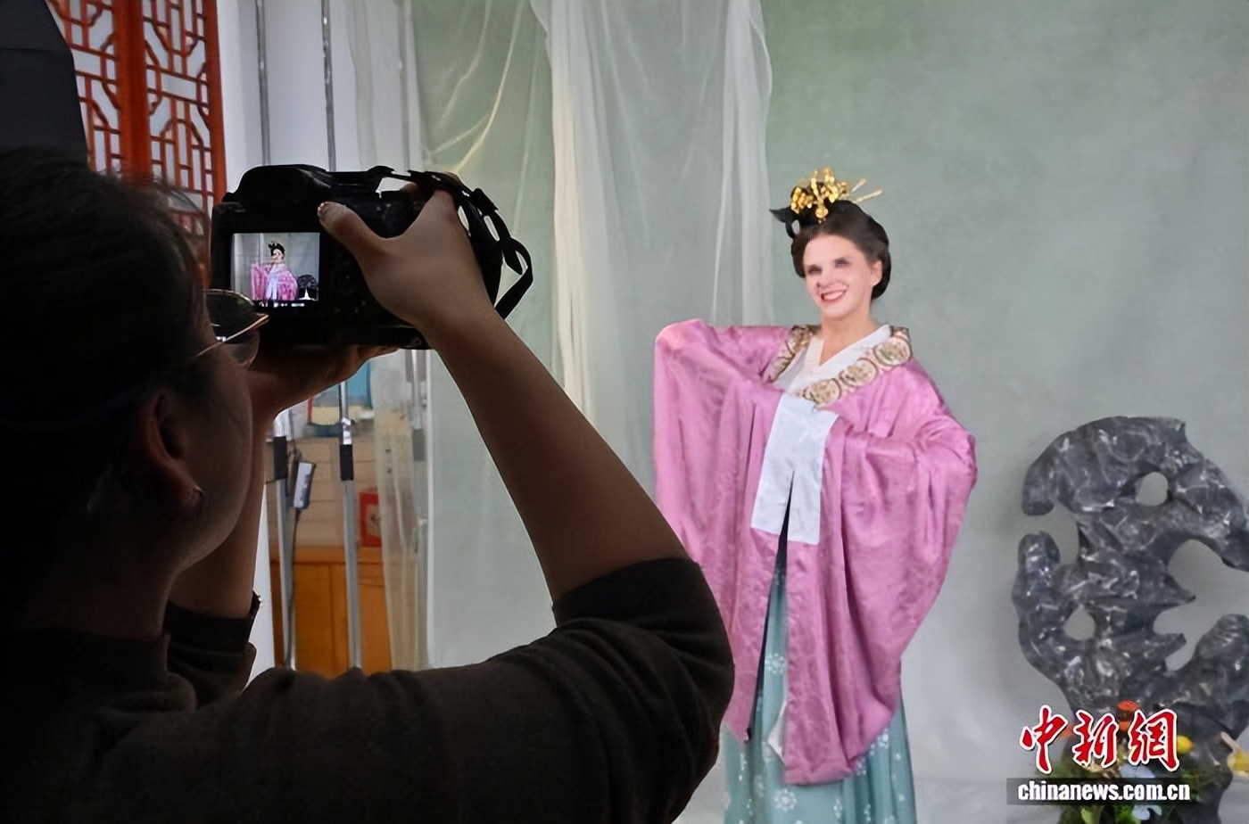 11月9日,在吉林长春的一家汉服体验馆,德国友人身着精美汉服拍摄照片。近年来,汉服日益受到外籍人士青睐。该馆已为超百名外籍人士提供汉服体验和拍摄服务,让他们在沉浸式拍摄中,了解中国传统文化。中新社记者 张瑶 摄
