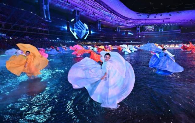 身穿五颜六色舞裙的演员一齐舞动旋转,整个开幕式舞台仿佛化为一片流动的花海……