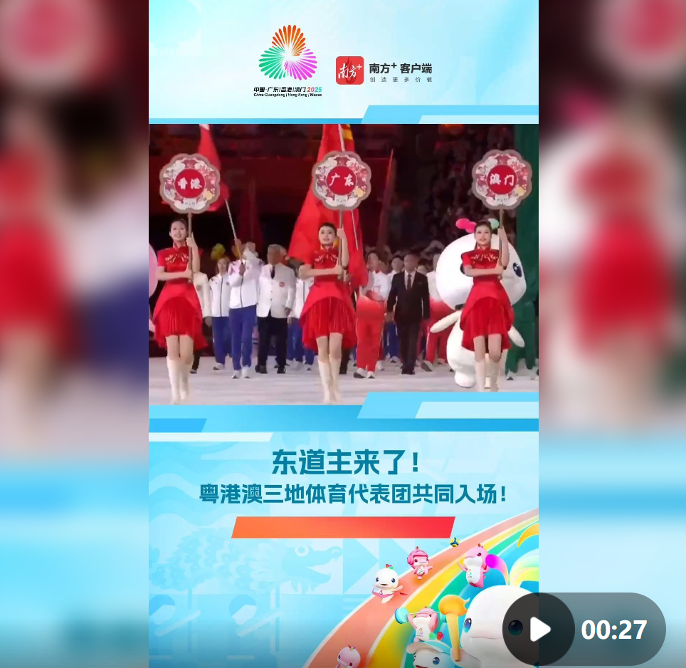 粤港澳三地首次携手承办全运会,这是“一国两制”框架下体育领域的重大创新。东道主广东、香港、澳门体育代表团入场,掀起全场高潮。