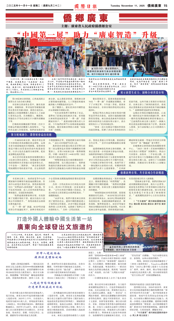 广交会举办期间,中国(广东云浮)—RCEP第三届产业合作大会、2025(秋季)首届广州国际汽车产业出口展览会等也在举行。这些盛会为全球客商提供机遇和多元体验的同时,也为中国企业“出海”提供了平台,助力“广东智造”持续在全球价值链中攀升。