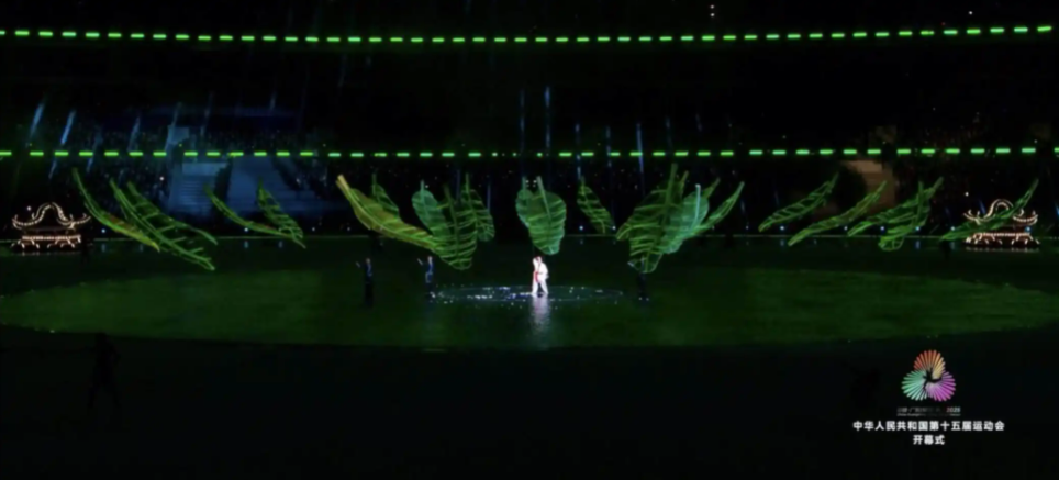 在十五运会开幕式的舞台上,粤港澳三地一脉相承的岭南千年非遗精髓被生动激活。除了长达近30米的“鳌鱼”巡游全场外,咏春、南拳刚柔并济,粤剧名家联袂登台,醒狮、英歌、龙舟等岭南非遗“顶流”与AIGC、VR、AR等技术相互交融。此外,广绣、广珐琅、嵌瓷等经典岭南工艺,经过创新设计后也转换为巨型灯笼戏台装置上的花卉纹样,别致新潮。