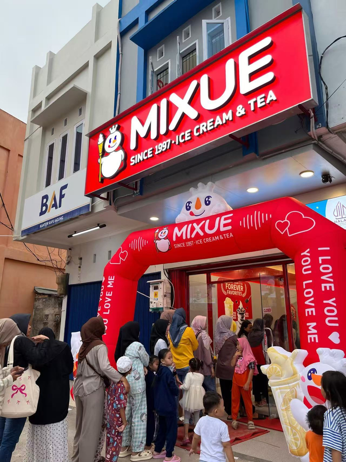 在印度尼西亚尘土飞扬的街边、繁忙的店屋和现代购物中心里,蜜雪冰城鲜红色的招牌和雪人Logo正悄然成为一道日常风景。