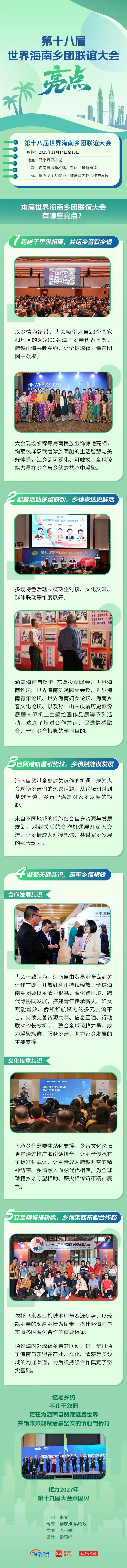 亮點關注華人華僑海外留學東盟新聞 全球琼籍乡亲槟城“奔现”!一图读懂第十八届世界海南乡团联谊大会 2025 年 11 月 24 日 第十八届世界海南乡团联谊大会 于11月14日至16日在马来西亚槟城举办 大会以乡情为纽带 吸引来自23个国家和地区的超3000名 海南乡亲代表跨越山海共赴槟城“奔现” 这届世界海南乡团联谊大会有哪些亮点? 一起来解锁 ↓↓↓ 完 来 源:南海网、新海南客户端