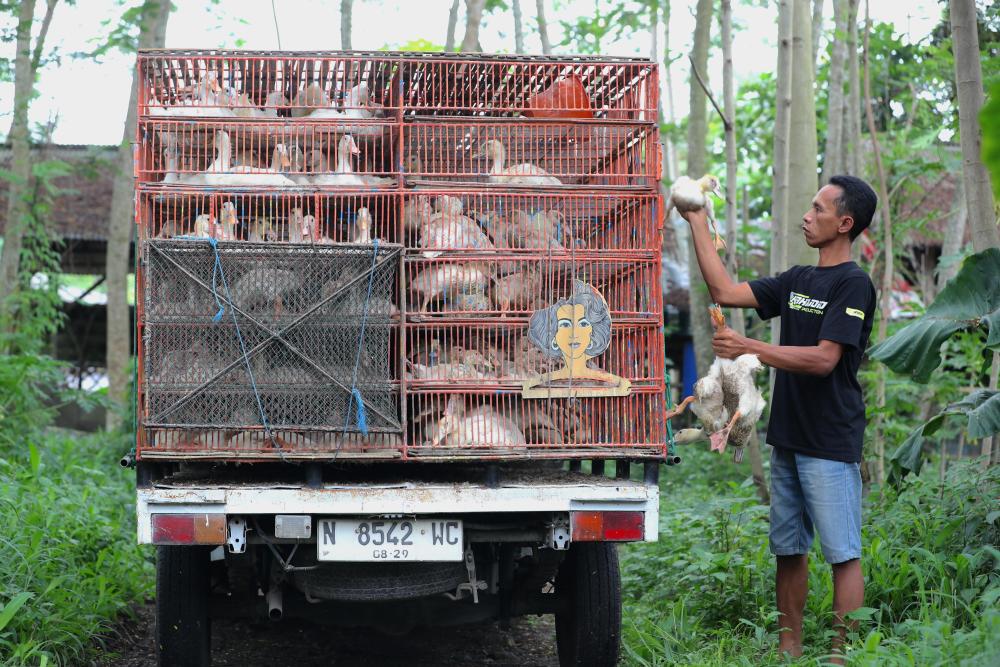 ↑11月13日,在印度尼西亚东爪哇省布尔沃索诺村,工作人员将从养殖户手里收来的鸭子装车。