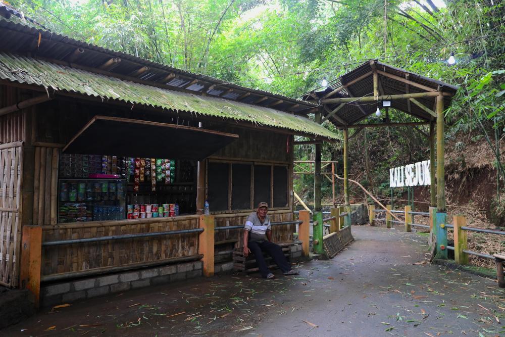 ↑这是11月13日在印度尼西亚东爪哇省布尔沃索诺村“清凉溪”旁拍摄的村民瑟拉梅特和家人开的小卖部。