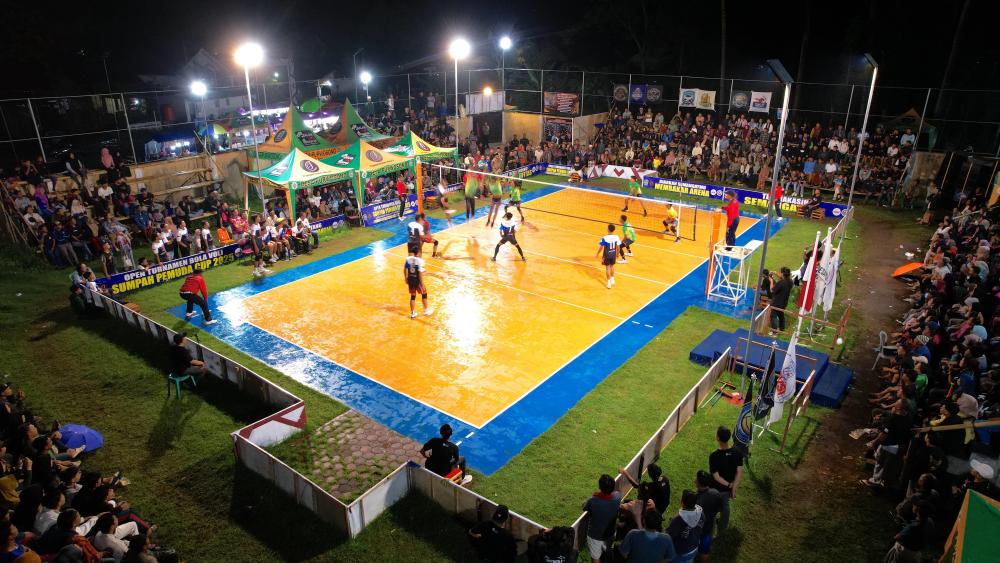 ↑11月13日,在印度尼西亚东爪哇省布尔沃索诺村排球场,观众观看排球比赛。