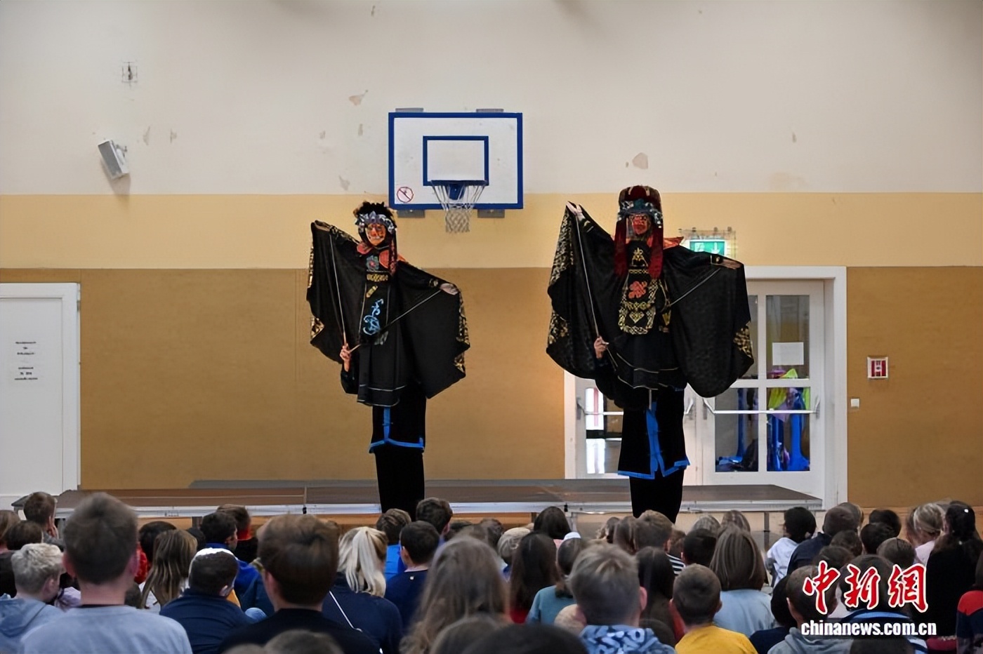 当地时间11月21日,艺术团在德国勃兰登堡州巴特利本韦达市的罗伯特·赖斯小学呈现《变脸》节目。柏林中国文化中心 供图