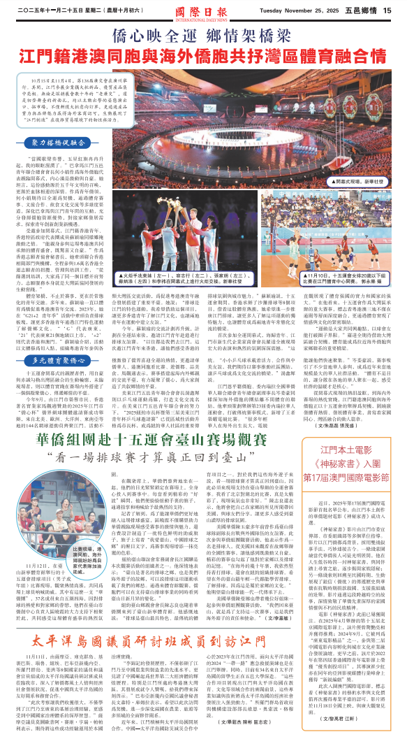 从开幕式现场的热泪盈眶,到海内外赛场的热忱实践,江门籍港澳同胞与海外侨胞正以十五运会的举办为契机,围绕激发体育热情、发展体育事业,书写着家国同心、湾区融合的动人篇章。(文/朱磊磊 张茂盛)
