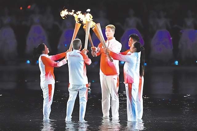 火炬手冼东妹(左一)、容志行(左二)、张家朗(左三)、苏炳添(左四)和李祎在开幕式上进行火炬交接。
