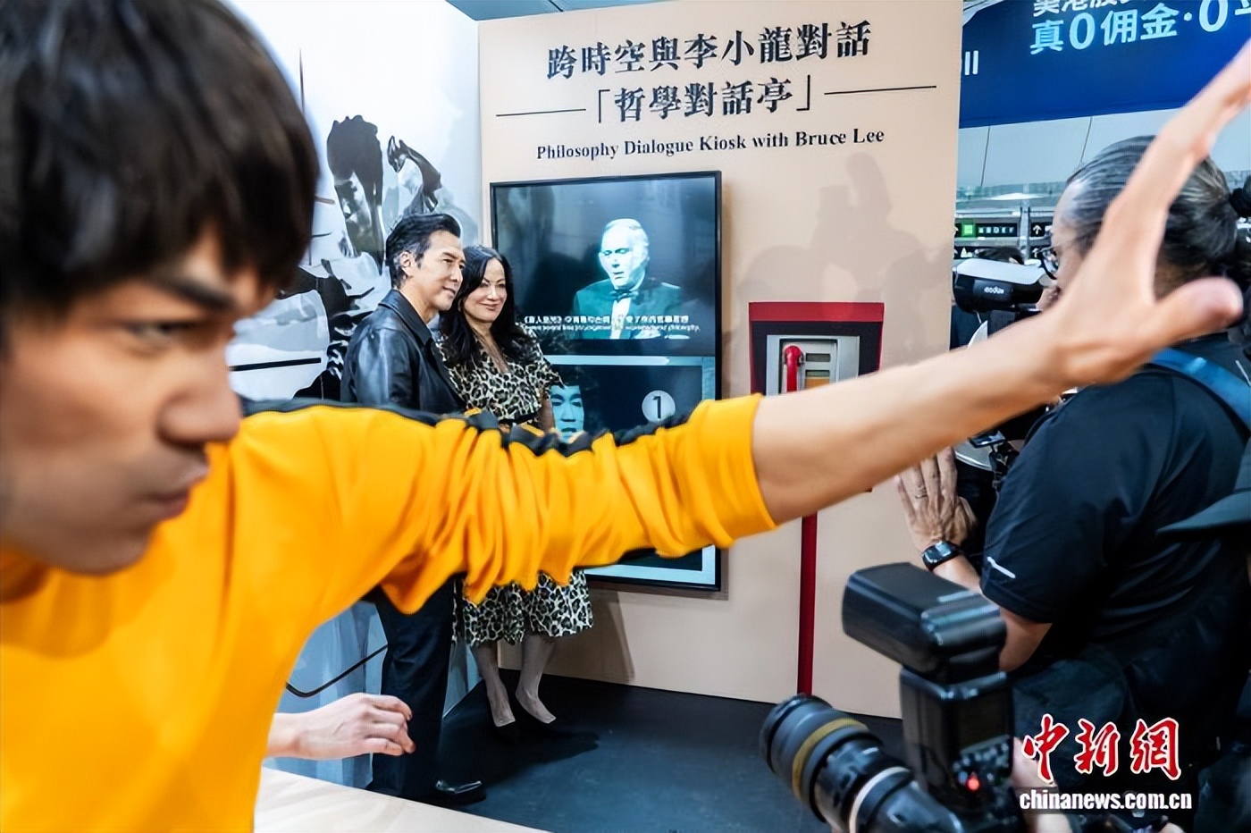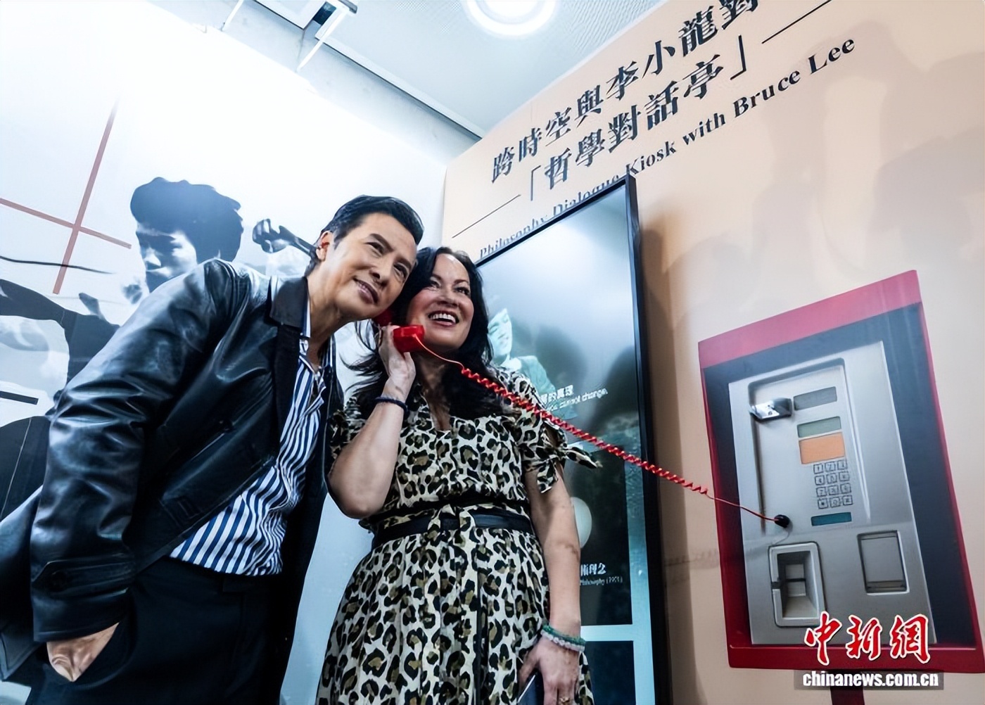 图为李小龙基金会创办人兼会长、李小龙之女李香凝(Shannon Lee,右)和动作影视明星甄子丹在港铁香港站内的“电话亭”互动展区聆听李小龙的声音。中新网记者 侯宇 摄