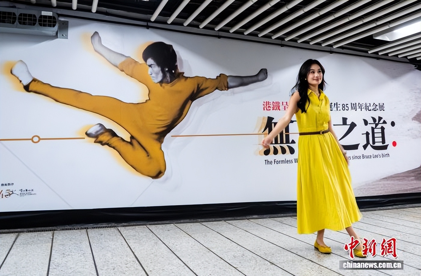 图为一位女士在港铁中环站内的特展区域内模仿海报上李小龙的动作。中新网记者 侯宇 摄