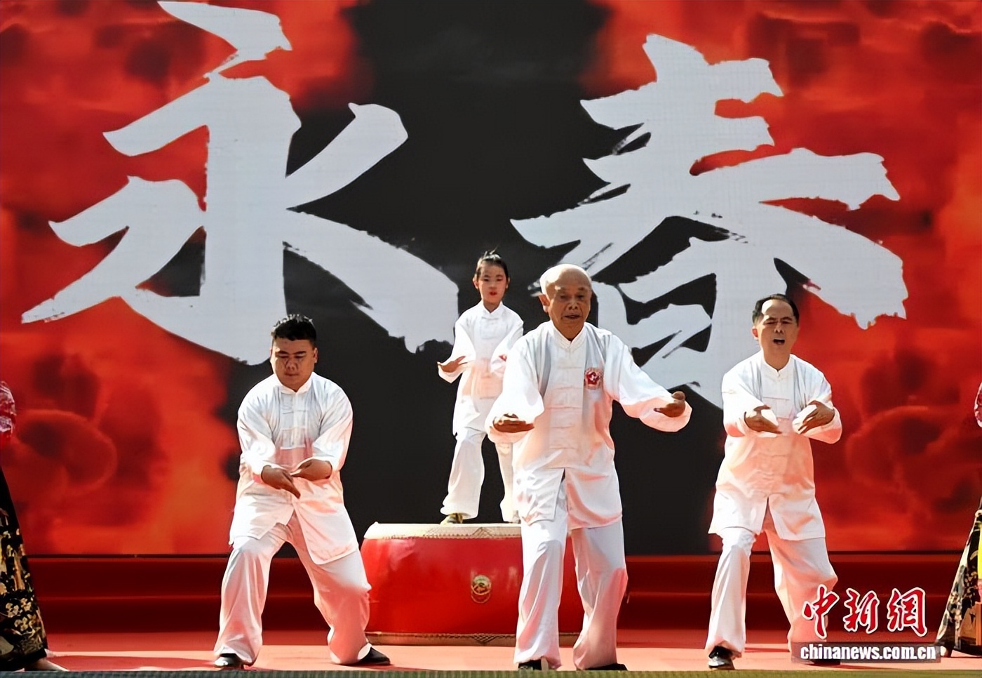 11月24日,2025年永春白鹤拳传承发展大会在福建永春举办。来自中国、马来西亚、英国、意大利、俄罗斯等国家的海内外武术界代表、专家学者齐聚“白鹤拳故乡”,以拳为媒、以武会友,共话中华武术的创新发展之路。白鹤拳发源于中国知名侨乡永春县,有着“东方神拳”的美誉。历经300多年的传承发展,永春白鹤拳已远播全球80多个国家和地区,每年吸引着数千名“洋弟子”前来永春学习。图为81岁的苏瀛汉(中)一家三代同台表演永春白鹤拳。中新社记者 吕明 摄