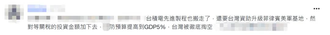 该消息立刻在岛内激起民愤。不少台湾网友留言痛斥:“做狗还要贴钱给主人?”“剩余价值要榨干!”更有台湾网友指出,台积电先进制程被转移后,再要求台湾资助美军基地升级、提高防务预算,将导致“台湾被彻底掏空”。