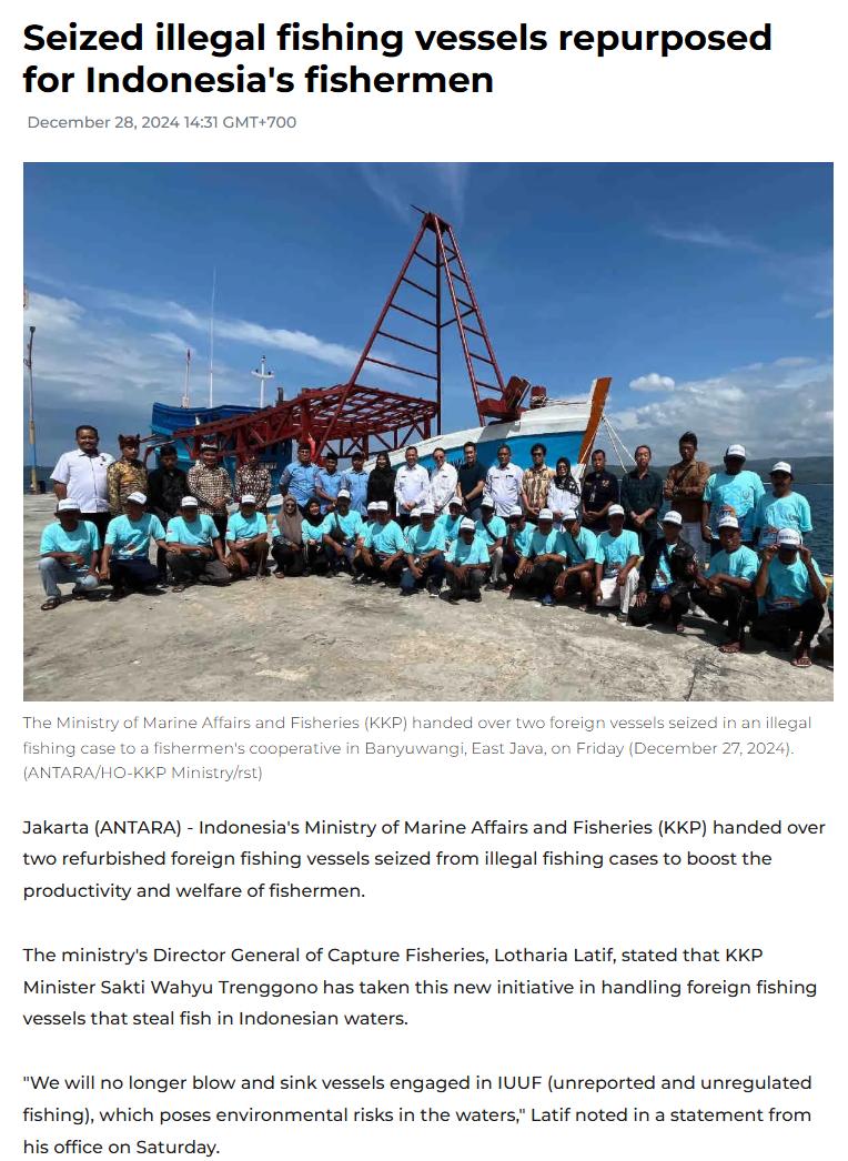 2024年12月28日,据安卡拉通讯社报道,印尼海洋事务与渔业部(KKP)向渔民捐赠了两艘翻新的外国渔船,这些渔船是从被裁定为非法捕捞的案件中查获的。该部门渔业捕捞总局局长洛萨里亚·拉蒂夫当时表示,印尼“将不再击沉从事非法、未报告和不受管制的捕捞活动的船只,(因为)这些活动对水域环境构成风险”。