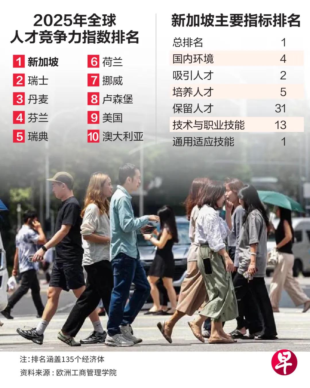 新加坡首次问鼎全球人才竞争力排行榜,取代多年领跑的瑞士。但新加坡留住人才的排名相对其他指标仍较低,且技术与职业技能排名跌出前十,显示中层劳动力在适应行业变化上存在隐忧。
