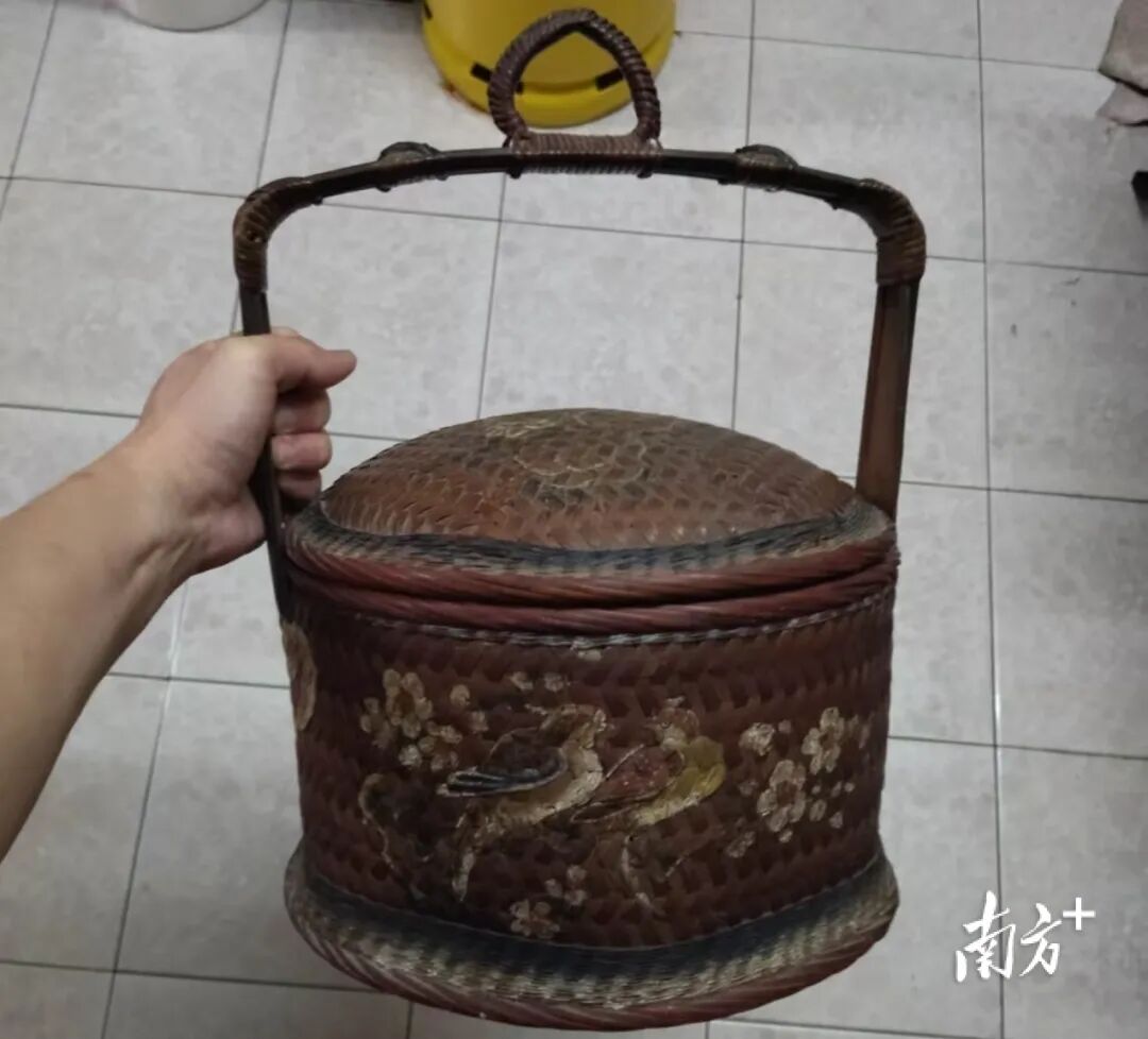 潮籍华侨陈声丰在马来西亚家中仍保留祖母“过番”时所带花篮。受访者供图