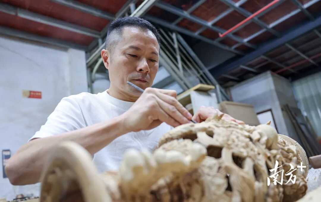 潮州木雕匠人卢庆合正在创作。黄品摄
